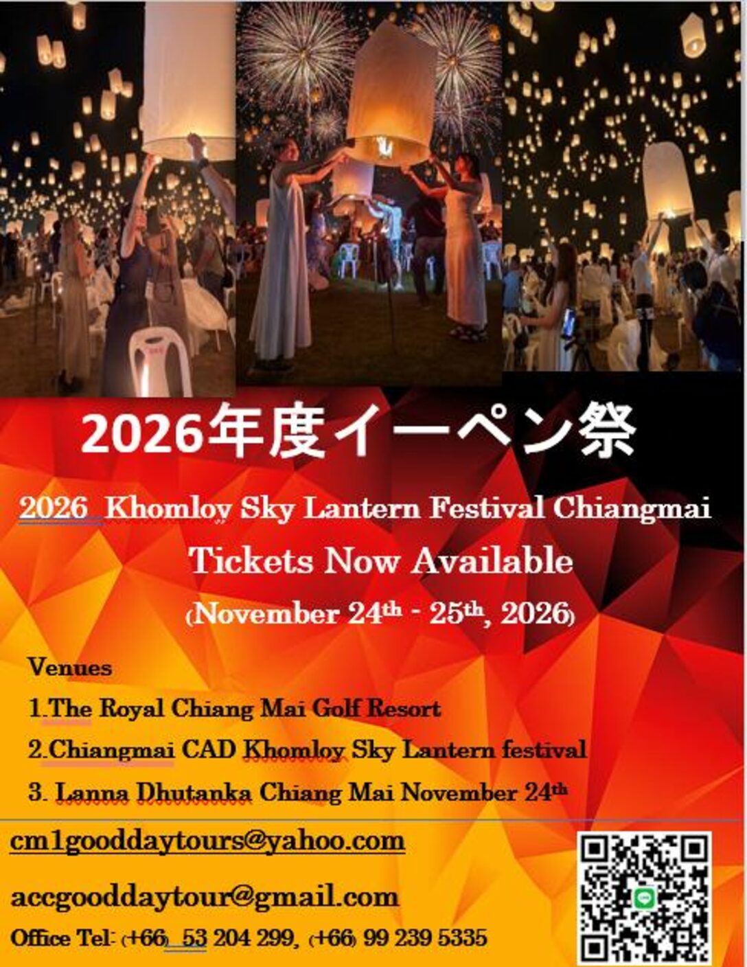 2026 Khomloy Sky Lantern Festival ChiangMai Event Tickets Now Available Posted on May 13, 2024January 30, 2026 by khom loy lanterns festival 2026 Chiang Mai Good Day Tours is pleased to announce the commencement of Ticket the 2026 Klomloy Sky Lantern Festival@Chiang Mai event! This year's festival will take place over two days on November 24th and 25th If you are interested, please contact us at our email address: cm1gooddaytours@yahoo.com Tel: (+66) 53 204 299 , (+66) 99 239 5335 2026年度イーペン祭り(コムローイ祭り)イベント参加チケット販売♪♪ チェンマイグッドディツアーでは、 2026年のイーペン祭りイベント参加チケットの販売を開始致しました! 今年は11月24日(火)と25日(水)の2日間となります。 ご興味のある方は弊社(cm1gooddaytours@yahoo.com), (+66) 53 204 299 , (+66) 99 239 5335 までお問い合わせ願います。 #chiangmaigooddaytour #Northen #Thailand #Tour #Chiangmai #Chiangmaitour #Tour #organize #Happytime #Tranking Tour #TaxiCNX #Gooddaytour #Komloy #CNX #GuideCNX #Lowcosttour #年度イーペン祭り #コムローイ祭り #チェンマイ #観光 #ツアーガイド #ガイド Posted in News, News 202ุ6.