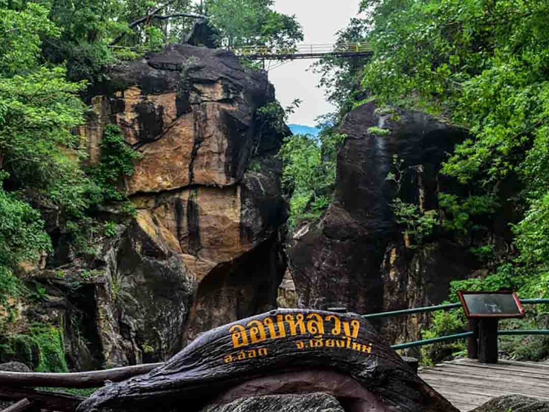 is an interesting place to visit where nature creates beauty and awe in the same place. It is because of the geography of Ob Luang that below is a river that meanders through the Khao Khat Pass. This gorge is characterized by a steep cliff and is very narrow, narrowing the water flow. Therefore, the river here is very rapid. There was a loud sound of water hitting the cliffs all around. There is also a bridge connecting Khao Khat Pass for tourists to view the beautiful scenery of Ob Luang. Within the area of Ob Luang Park Prehistoric archaeological sites have also been discovered, such as ancient human tombs. There are also white paintings at the Pha Chang shelter area.