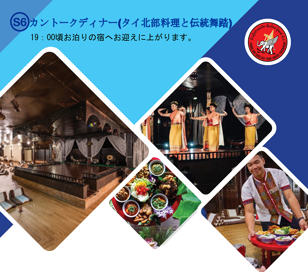 S6-カントークディナー(タイ北部料理と伝統舞踏) Posted on July 16, 2020May 13, 2024 by 美味しいタイ北部料理とすてきな伝統舞踏をお楽しみ下さい。 お泊りの宿へのお戻りは21:00頃となります。 ご料金: 1名様当りのご料金 2名様催行 @1,000B 3名様催行 @950B 4名様以上催行 @900B (*料金に含まれるもの:専用車、日本語ガイド、夕食、保険) ( 予約手配のみ 1名様当り @100バーツ 予約&レストラン車による往復送迎代(ガイドなし) 1名様当り @670バーツ ) Posted in Sightseeing Tour.